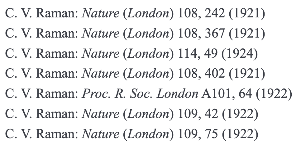 A small sampling of Raman’s publication. These papers are related to light scattering and form the foundation on which he made his famous discovery. Raman wrote more than 400 research papers in his lifetime (apart from monographs, lectures and public talks). Writing such a series of papers on a particular topic can be observed throughout his career.