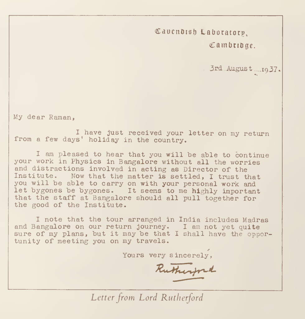 Here, he is consoling Raman after he quit the Directorship of IISc. Rutherford is also discussing his possible travel plans to India.