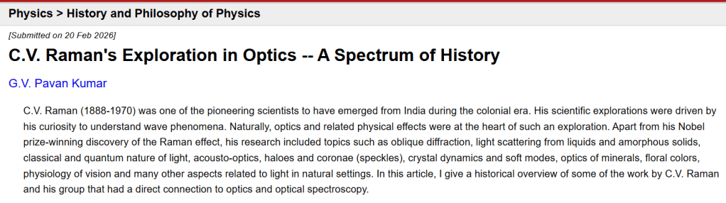 Journal of the Optical Society of America is coming up with a special issue on Optics in South Asia. I was invited to write a historical overview of Raman’s work on optics. Below is the snapshot of the pre-print. It should also appear in the axriv in the coming week. Meanwhile, you can access the preprint PDF below.