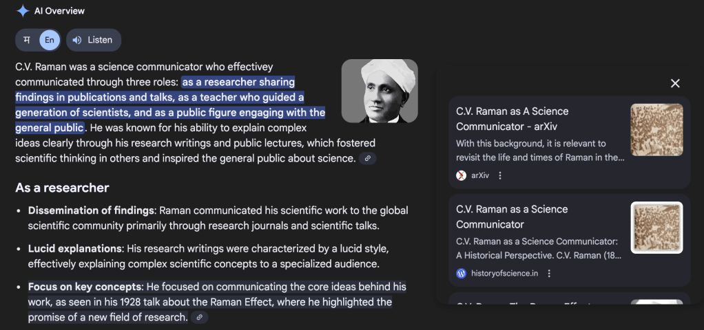 I see that the essay I wrote on CV Raman and made open access (thanks to Resonance, which published it) has been used by several educators on YouTube, including some in Indian languages. Also, the Google AI overview shows the published essay as the main reference for a search related to Raman’s science communication (see slideshow below).