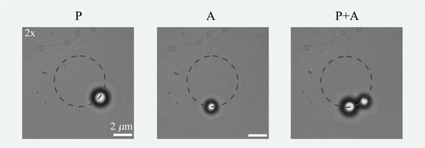 Interestingly, the revolution emerges only when an active and a passive colloid are combined (not as individuals) in a ring potential (dotted line)