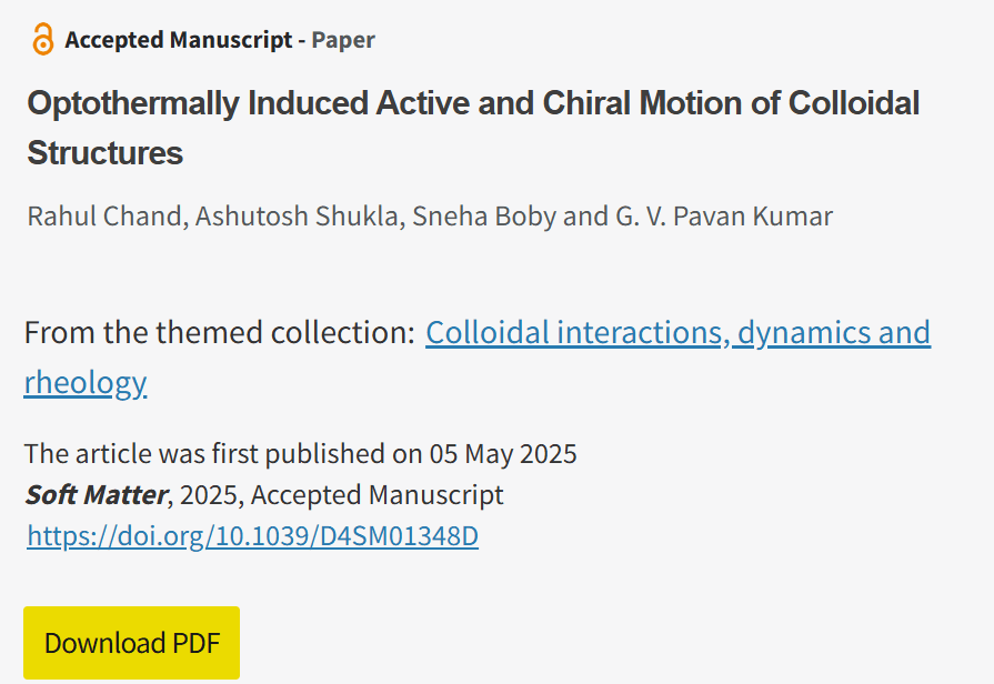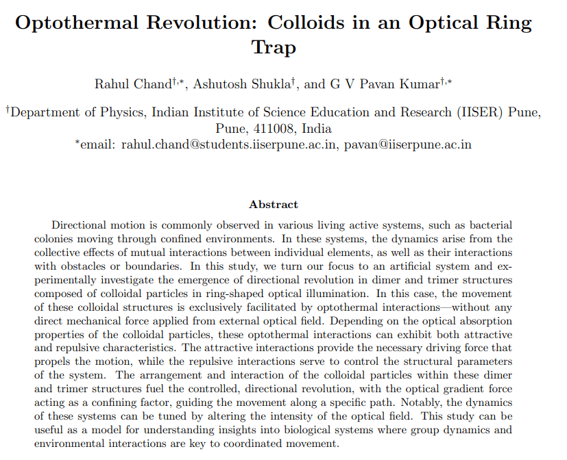 We have an Arxiv preprint on how a mixture of colloids (thermally active + passive particles in water) can lead to the emergence of revolution dynamics in an optical ring trap (dotted line). Super effort by our lab members Rahul Chand and Ashutosh Shukla.