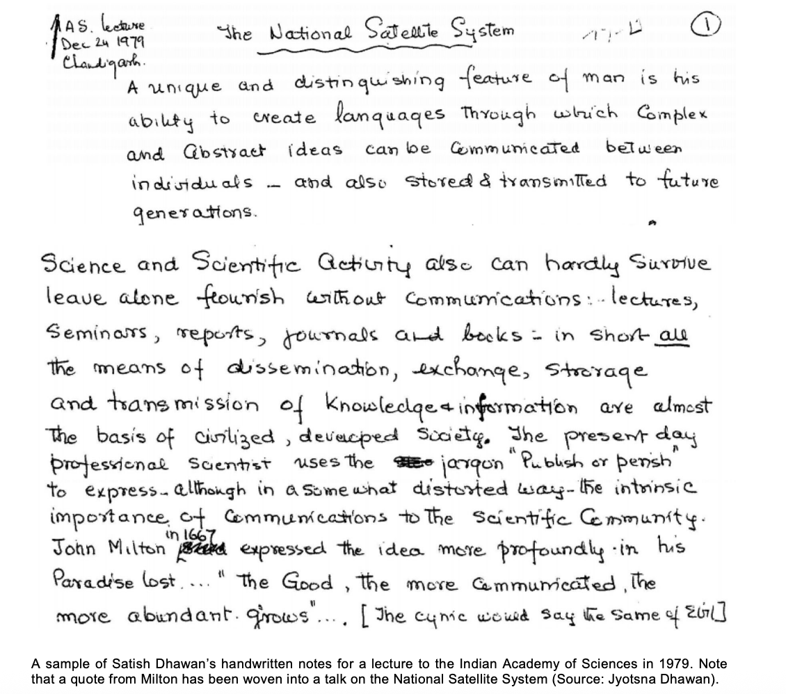 The first one is a lecture note from 1979, on making a case for a national satellite system and how it influences science and scientific activity (a copy of this note has been reproduced in a wonderful tribute to Satish Dhawan written by P. Balaram on his birth centenary2).