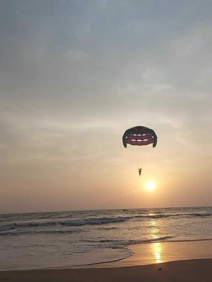 This is my daughter and me flying high on boat-assisted paragliding, circa June 2023, somewhere near North Goa…was riveting 3 minutes up in the sky…a great experience. The view towards the sun-set was great and so was the view in the opposite direction to the sun, where we could see backwaters from the top.